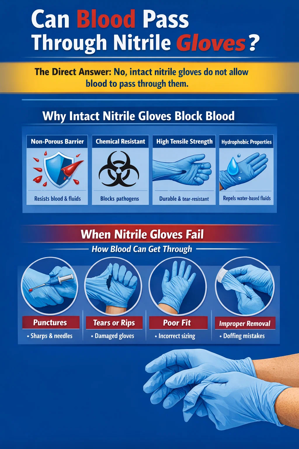 در شرایط عادی، دستکش های نیتریل دست نخورده اجازه نمی دهند خون از آنها عبور کند. لاستیک نیتریل ماده ای متراکم و مصنوعی است که یک سد مداوم در برابر مایعات از جمله خون و سایر مایعات بدن ایجاد می کند. این یکی از دلایل اصلی است که دستکش های نیتریل به انتخاب غالب در تنظیمات پزشکی، آزمایشگاهی و واکنش اضطراری در سراسر جهان تبدیل شده اند.