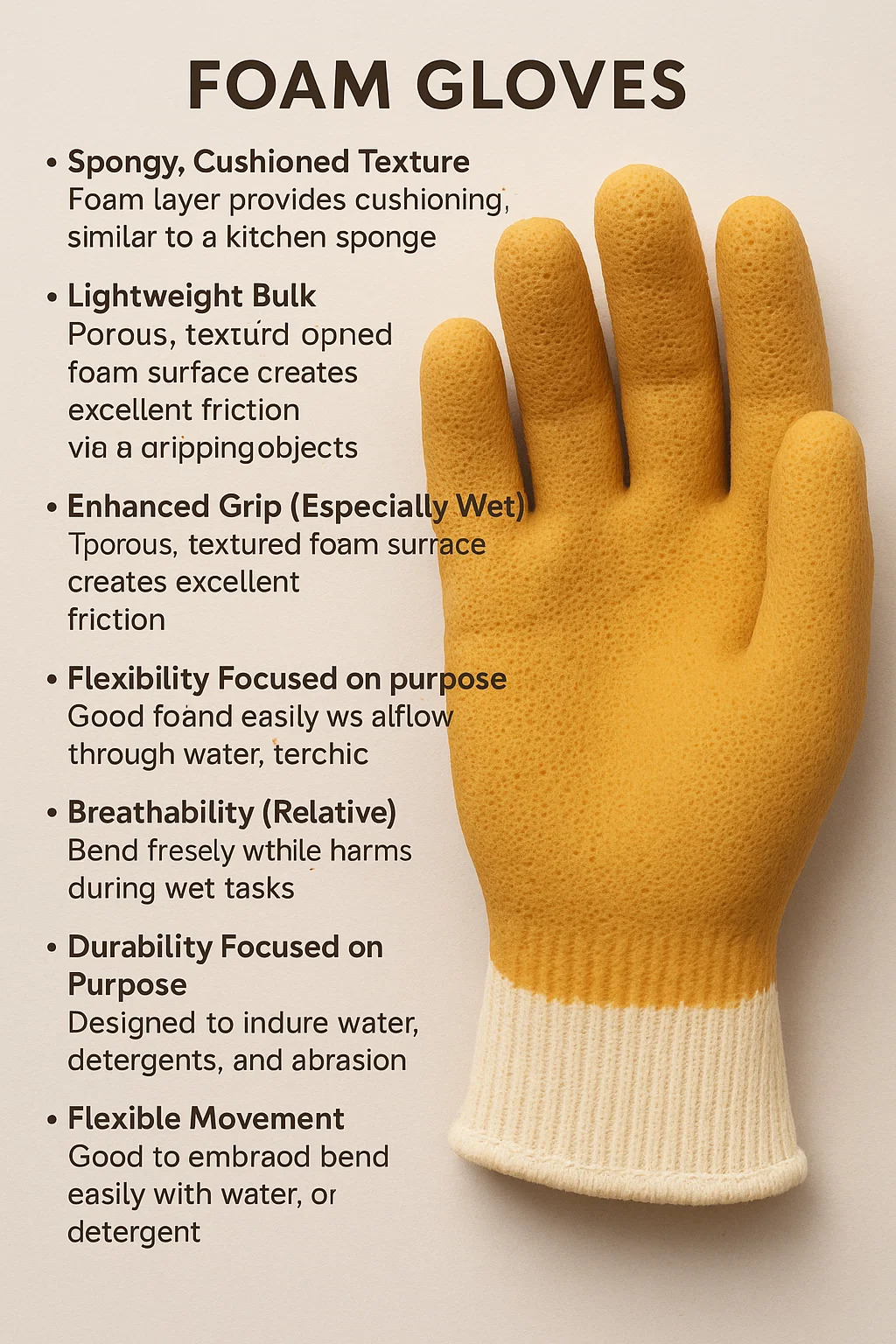 بیشتر دستکشهای فوم تمیزکننده دارای آستر پارچهای (پنبه، پلیاستر) برای راحتی در برابر پوست هستند که در فوم لاتکس یا PVC آغشته شده است.