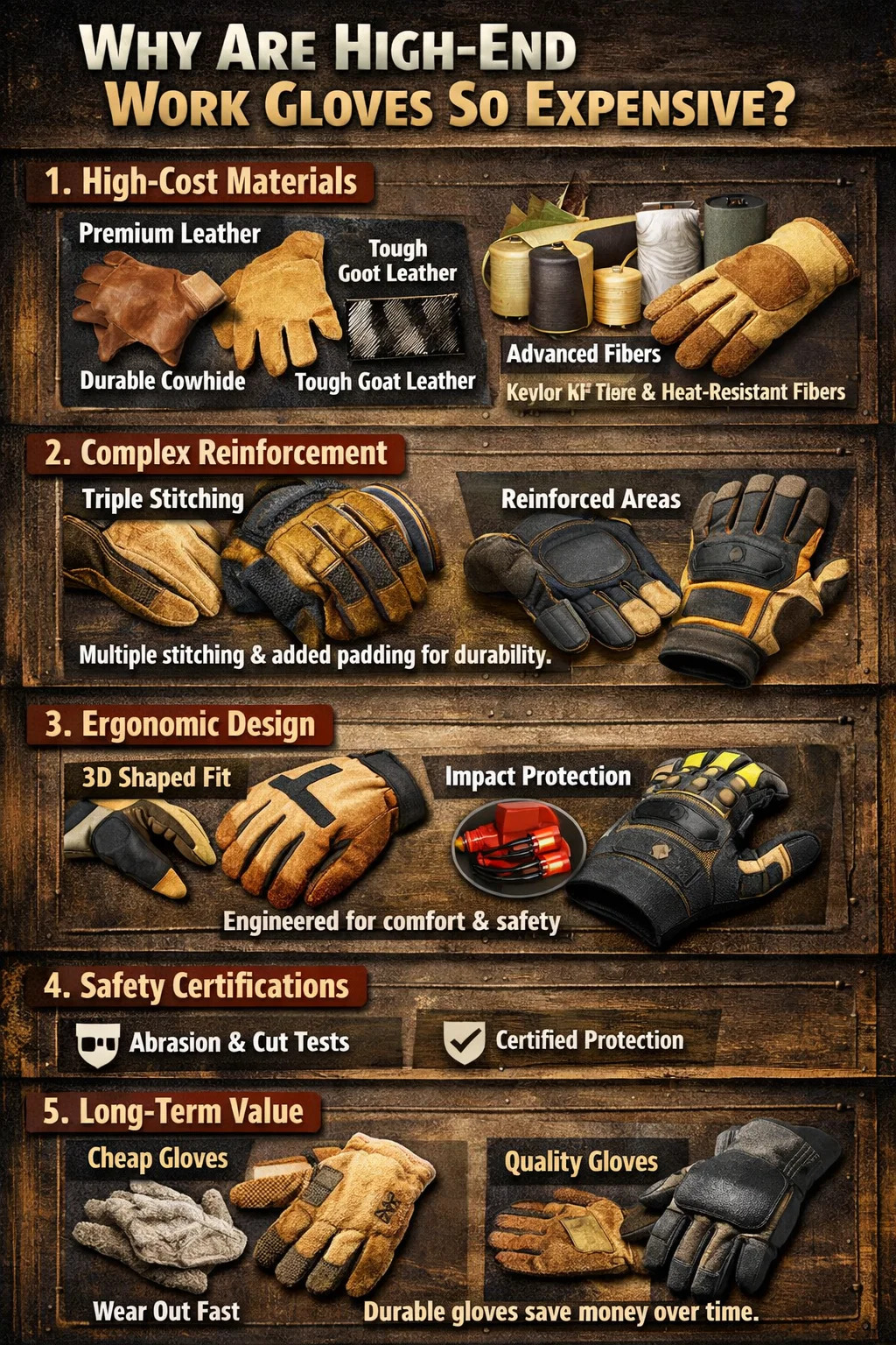 یک جفت دستکش ارزان قیمت چند دلاری ممکن است بعد از یک روز کار سوراخ شود و مجبور شوید دائماً جایگزین بخرید. با این حال، یک جفت دستکش کار با کیفیت بالا که به مدت شش ماه دوام میآورد ممکن است هزینه کمتری در روز نسبت به دستکشهای ارزانتر داشته باشد. این ارزش بلند مدت ناشی از دوام دلیل دیگری برای قیمت برتر است.