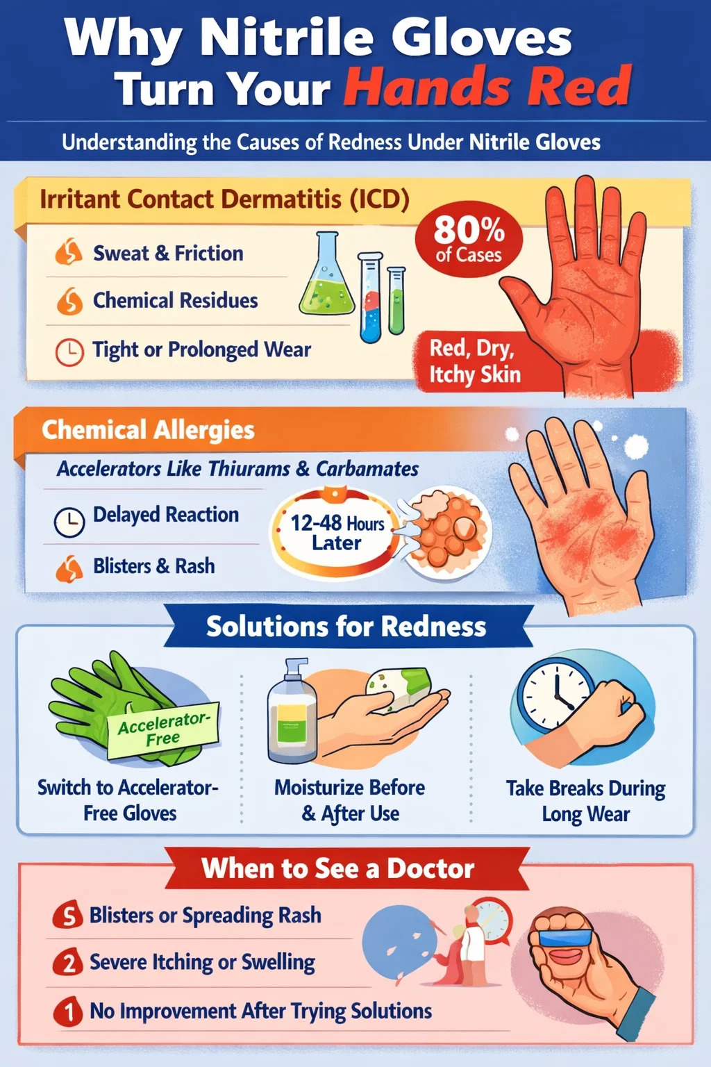 Most mild redness from nitrile gloves resolves on its own with a few days of rest and proper moisturizing. But certain presentations warrant professional evaluation, and ignoring them can allow a manageable condition to become a chronic occupational health problem.